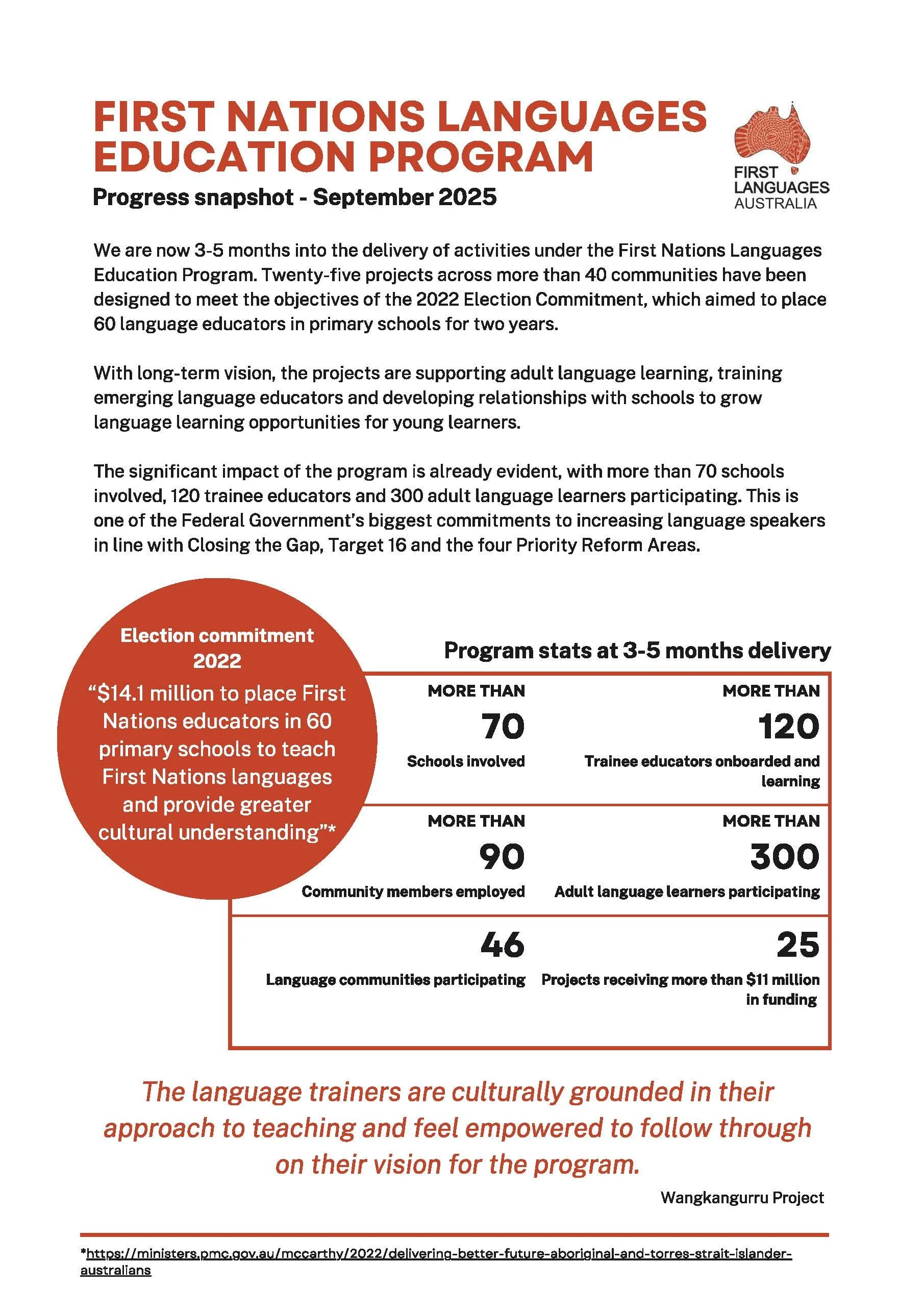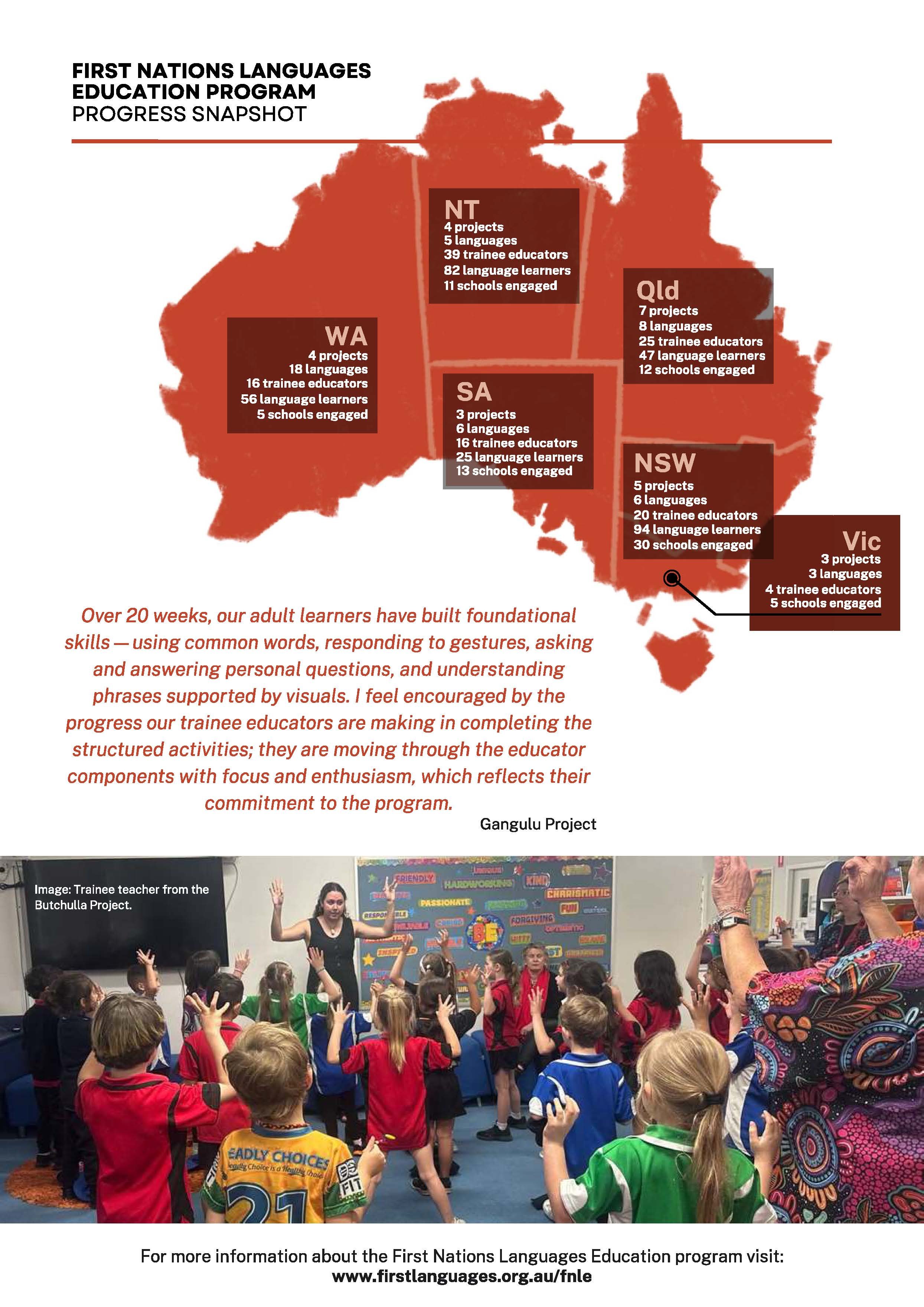The First Nations Languages Education Program will support community language learning activities that increase the numbers of language speakers and educators. The Australian Government Department of Education has partnered with First Languages Australia to design a national grant program sufficiently flexible to meet local language community needs.