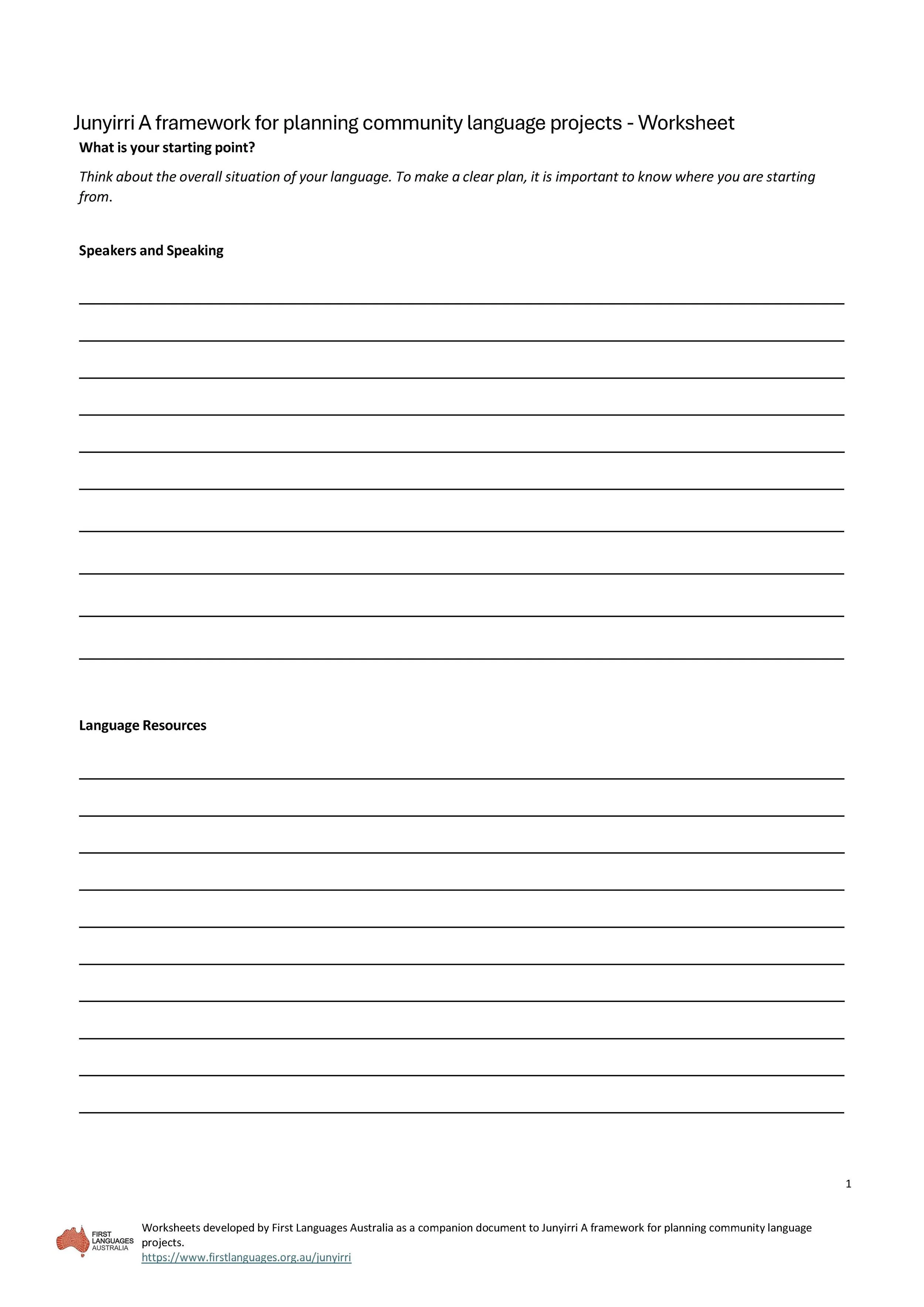 Junyirri Worksheet- this worksheet can be used during the delivery of a language planning workshop. Use this worksheet to document the conversations and decisions made during the workshop.